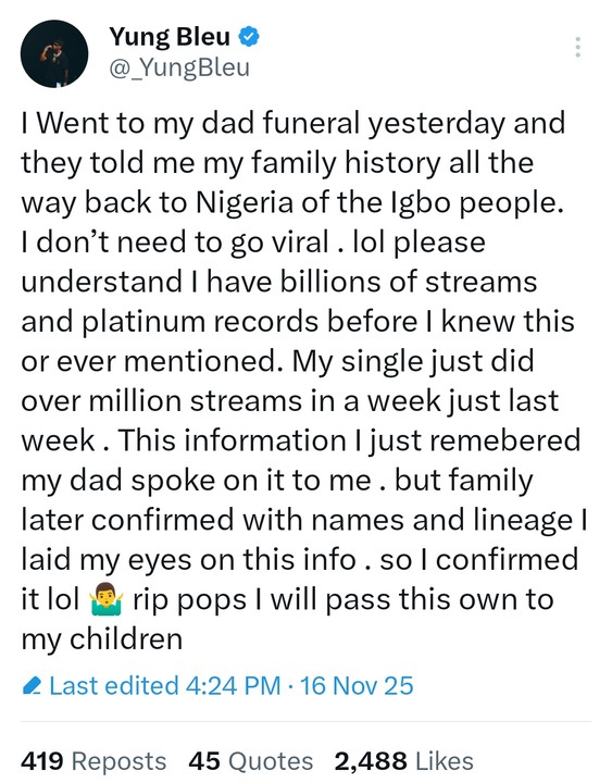 "I confirmed I’m igbo from Nigeria. Directly", Bleu said, noting that his father, while he was alive, told him everything and how they originated from the Igbo tribe of Nigeria.